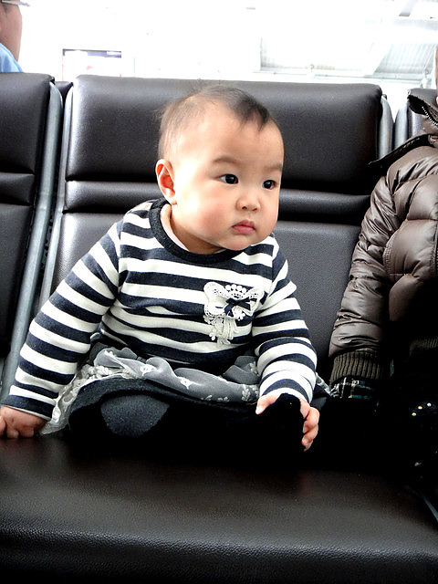 遠方廣撥登機的訊息她馬上站起來瞧瞧